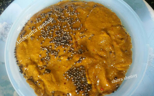 In summers when Mangoes were in plenty and all could not be consumed by the family – our clever elders just sun dried them well so that they could be used when mangoes were out of season ! This is Ambe sat – sweet and sour in taste and healthy too ! If dried and stored properly – it will keep for 1-2 years ! Ambesatta tamballi is a very old amchi recipe !