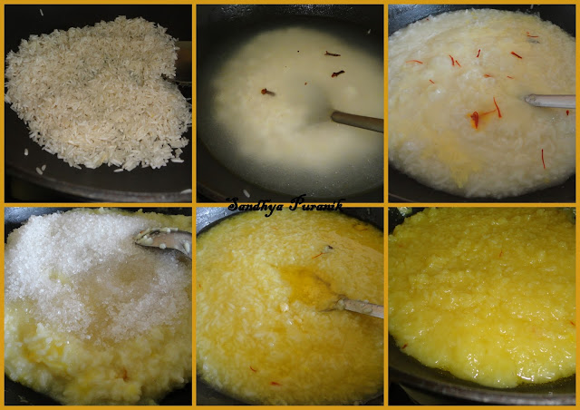 In South Canara this dish is prepared from a special variety rice which is called Jeersala or Ghansala but also can be prepared with Basmati rice. A very simple recipe but rich with the use of Ghee and Saffron. Do try this delicious sweet whenever possible .