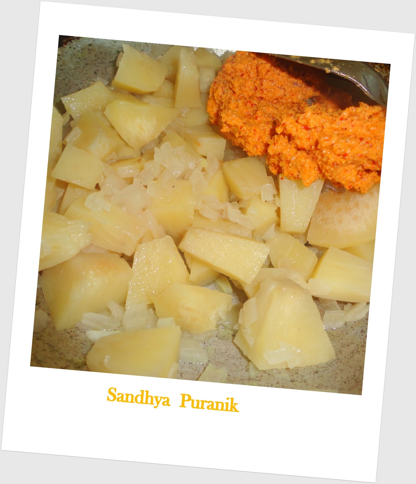 - Heat oil and add the chopped onions,when they are slightly pink add the breadfruit cubes,sprinkle some water and let it cook on low flame with lid closed.