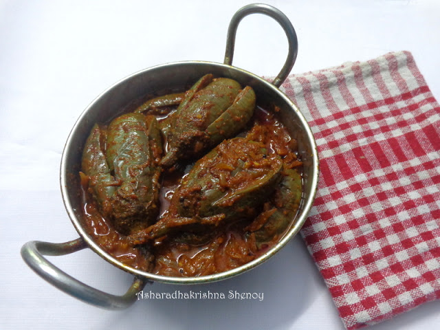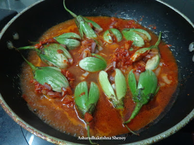Here we need to use small variety brinjal preferably but can be prepared with regular brinjals too. A basic masala is prepared and stuffed inside slit brinjals and cooked in tamarind sauce.If you are disinclined to stuff the brinjals or find insufficient time then chop the brinjals and follow the recipe as given below.The curry might look so hot but the onions and the tamarind which is the main ingredient of the curry balances the hot taste of the chillies. Even kids love this curry.Today I have used green variety baby brinjals but you can try with the purple ones too.Here is the recipe