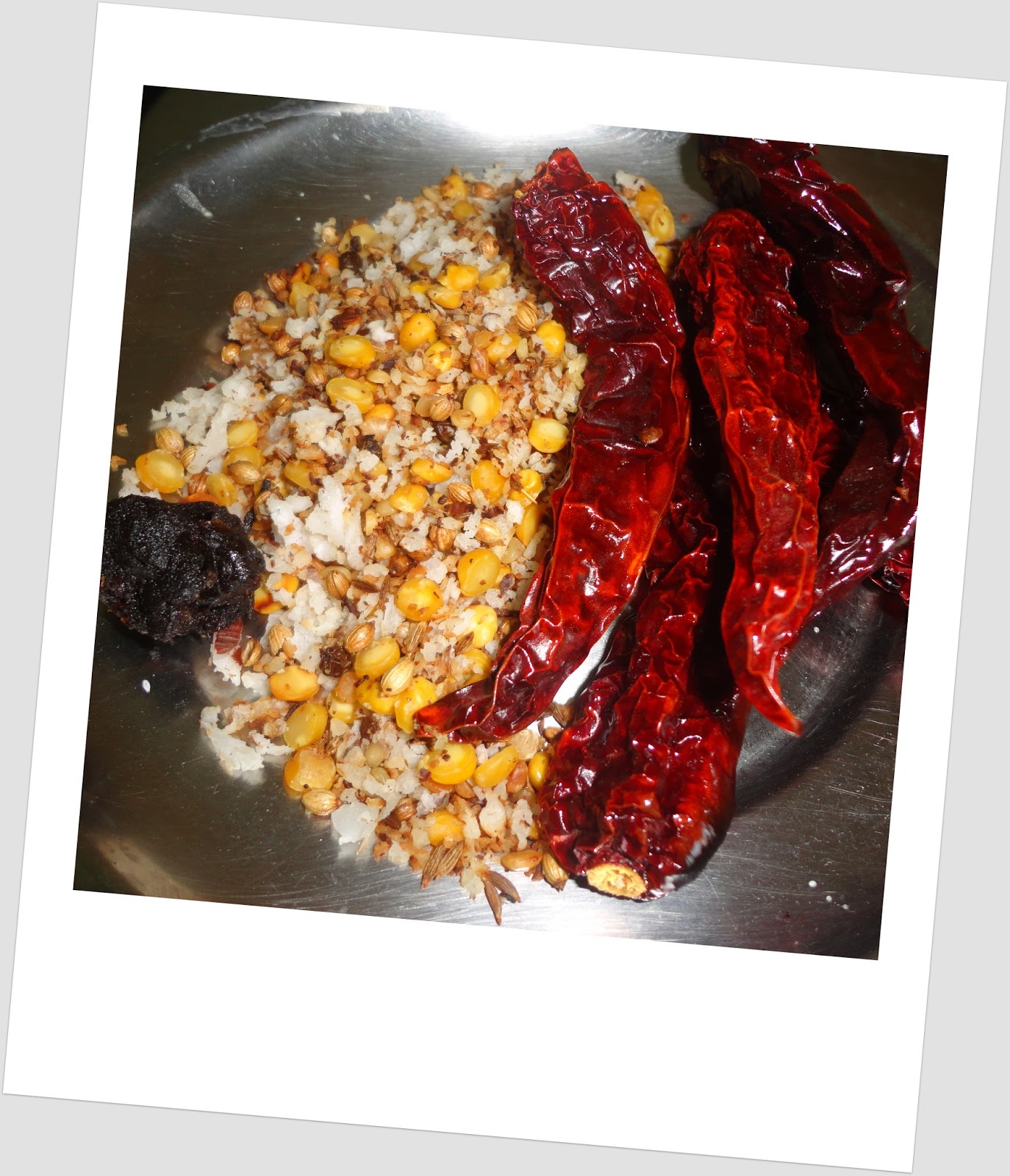 - Roast the Ingredients mentioned for “powder” in a pan except coconut and red chillies till they turn slightly brown and a aroma starts ..at this stage add the coconut and roast for further 2-3 minutes.Switch off and allow to cool.