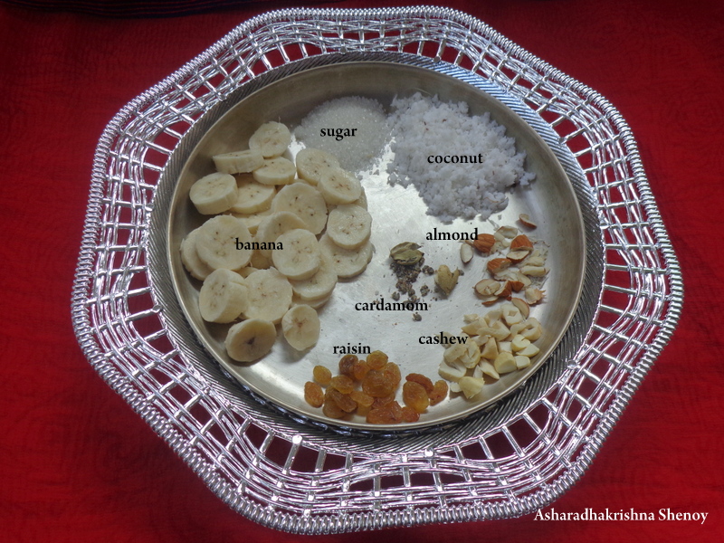 My amma used to prepare this kelya harshale on one of the days when performing this pooja. It is not that this should be prepared only on pooja days, but it can also be prepared as a evening snack for kids or as a mid-morning snack ! To make this delicious harshale you can use any variety of banana like kadali, rasbale/rasthali, yelakki, robosta varieties, jnalipoovan, poovan, mysore bale etc. Let us check for the ingredients. Here I am not giving any measurements as individuals taste differ between sweetness and coconut