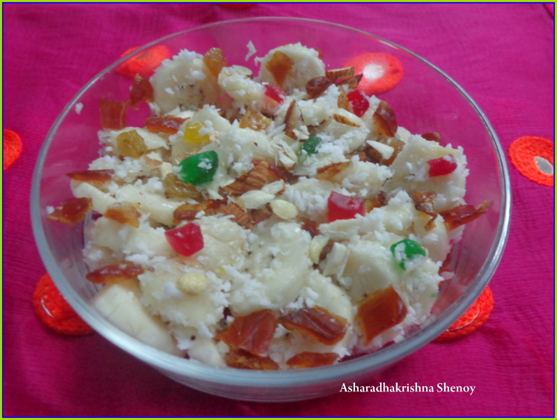 - Mix grated coconut, sugar, cardamom powder and the variety chopped nuts.