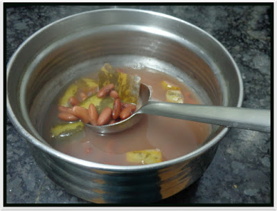 - If you want this to be a two in one curry then remove the water separately from the bean add cooked cucumber to the saaru and proceed with the seasoning.