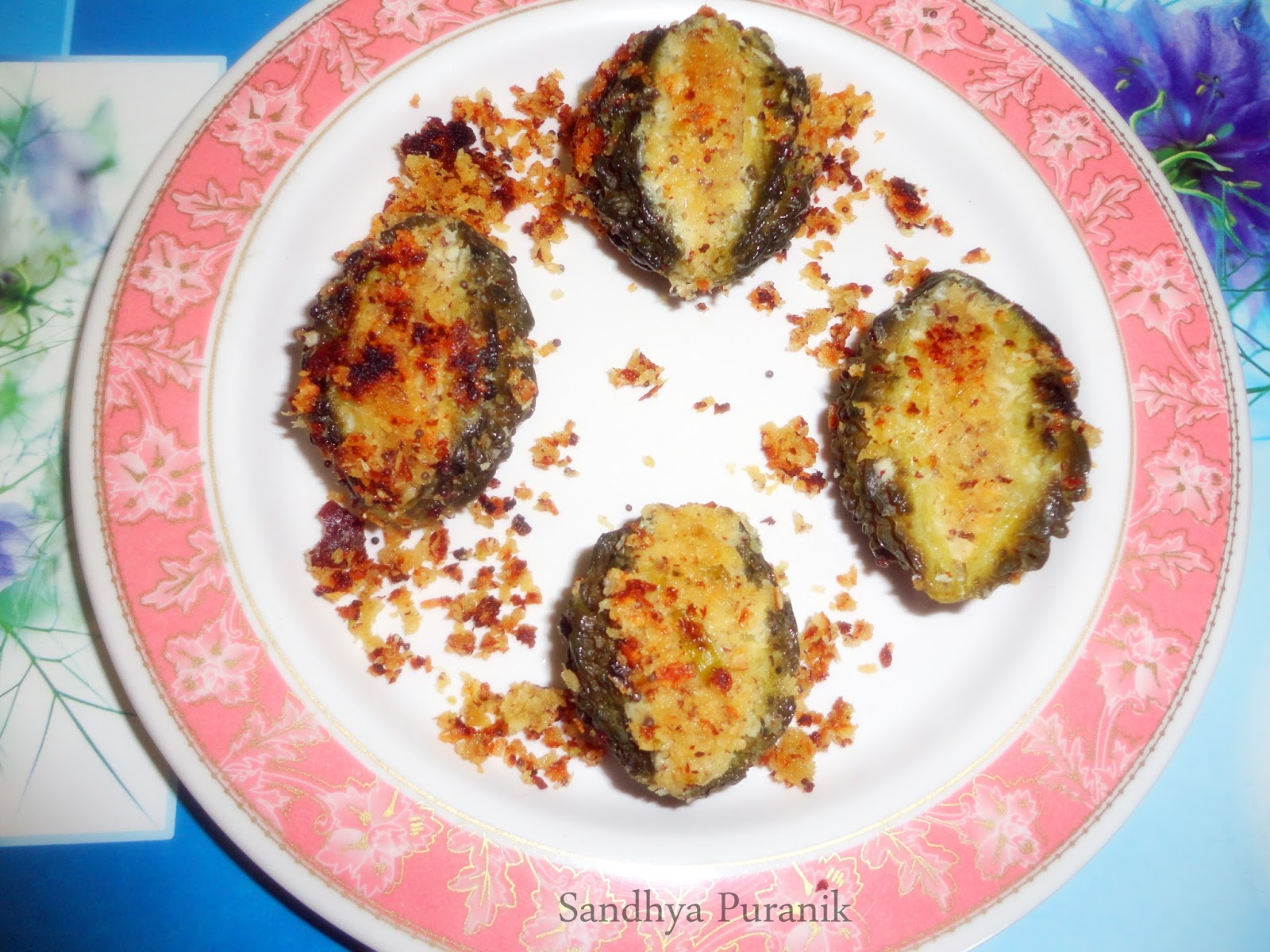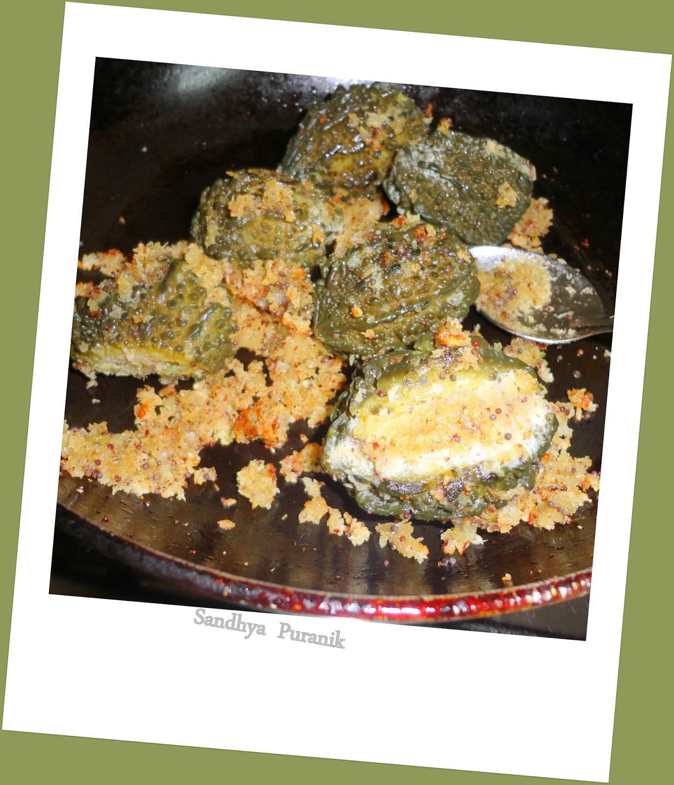 Heat oil and add the mustard seeds..when they splutter add the leftover coconut filling and saute for a minute..then place the steamed bitter gourds neatly one by one and roast on both sides till they are slightly brown.