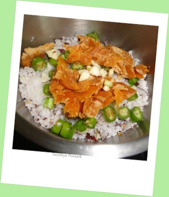 - Meanwhile grind coconut,garlic cloves,tamarind,jaggery and green chillies adding salt to a coarse paste.Do not add water.