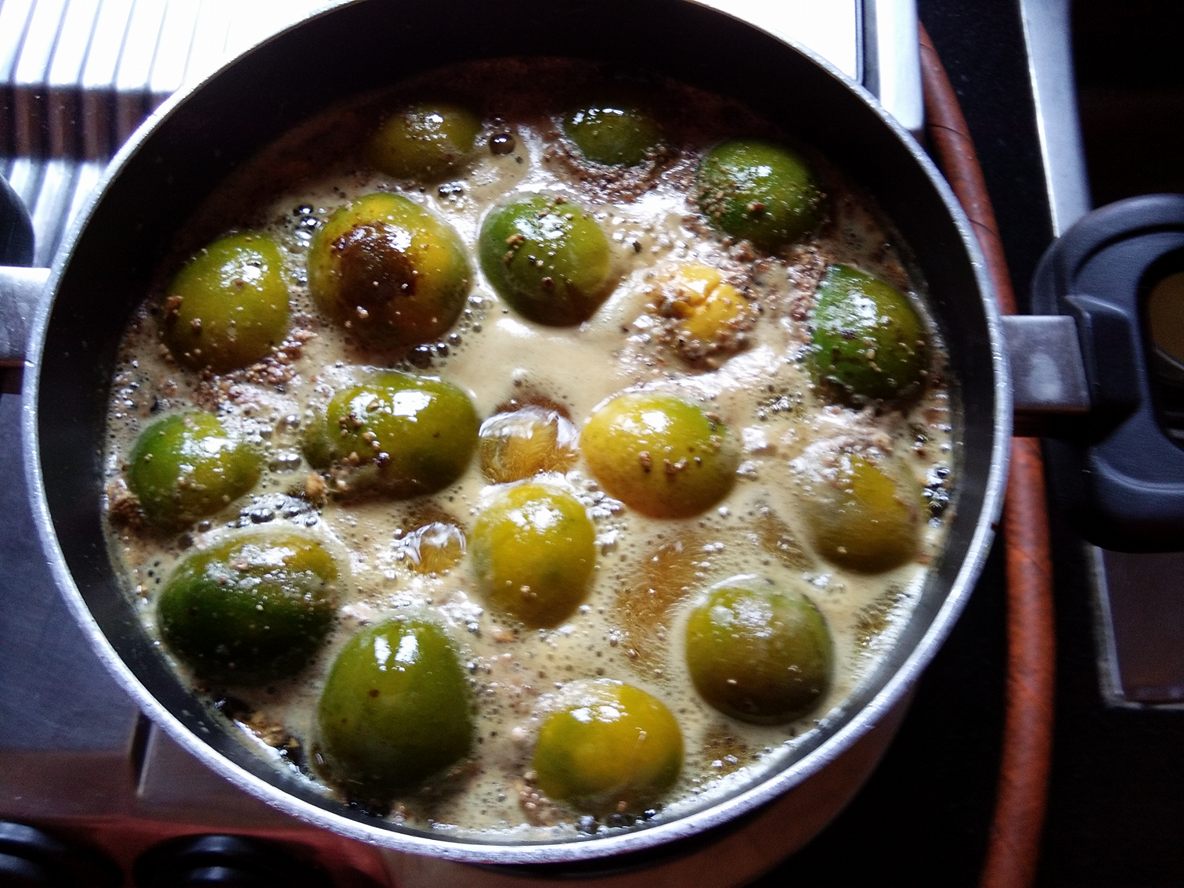 - Prepare jaggery syrup with a little water .To that add crushed dry ginger , pepper corns & elaichi. When the syrup starts boiling add the mangoes and cook till it becomes soft as shown in the pic below .