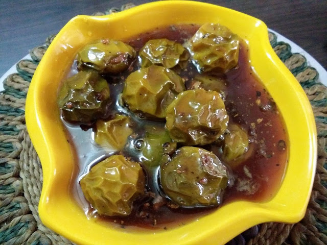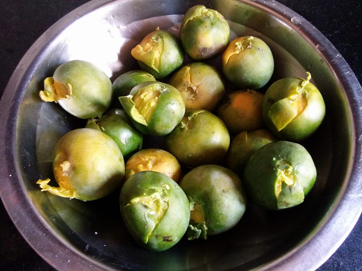Ukadambo means mangoes preserved in jaggery syrup.This is an old traditional nearly lost konkani recipe just like murabba .Small mangoes – which we call gointa are best for this dish. This can be done when these mangoes are available in plenty and preserved for future use.This recipe has been contributed by my dear FB friend – Veena Nayak
