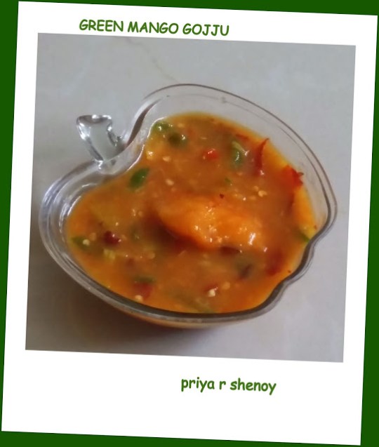 Raw Mango Gojju or Ambya gojju – just a mention of this and I always drool as I remember the tastiest gojju prepared by my grandmother with those green mangoes from our backyard at my native place. One lick of the gojju as a side dish with rice used to be a heavenly treat for us… So let me share the recipe with you .