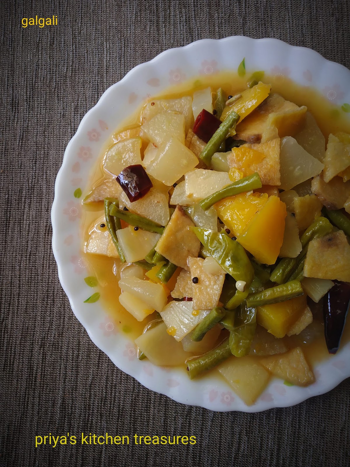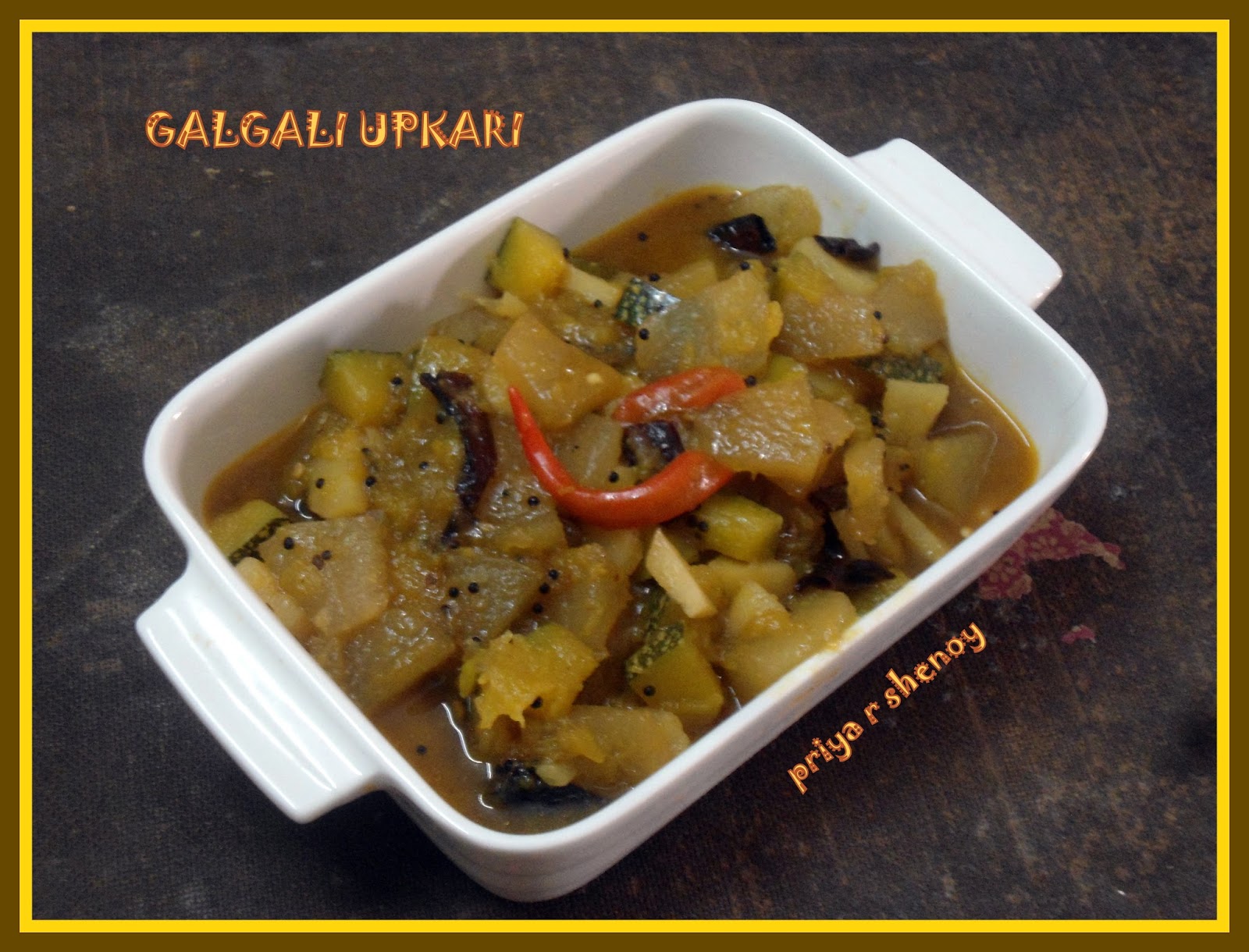 “Galgali ” – sounds amusing right ? It just means very mild and subtle . Galgali upkari is a sort of watery dish made with a mixture of veggies usually ash gourd, pumpkin and potato. The hing flavour brings a lovely taste to it and is an excellent side dish with rice.