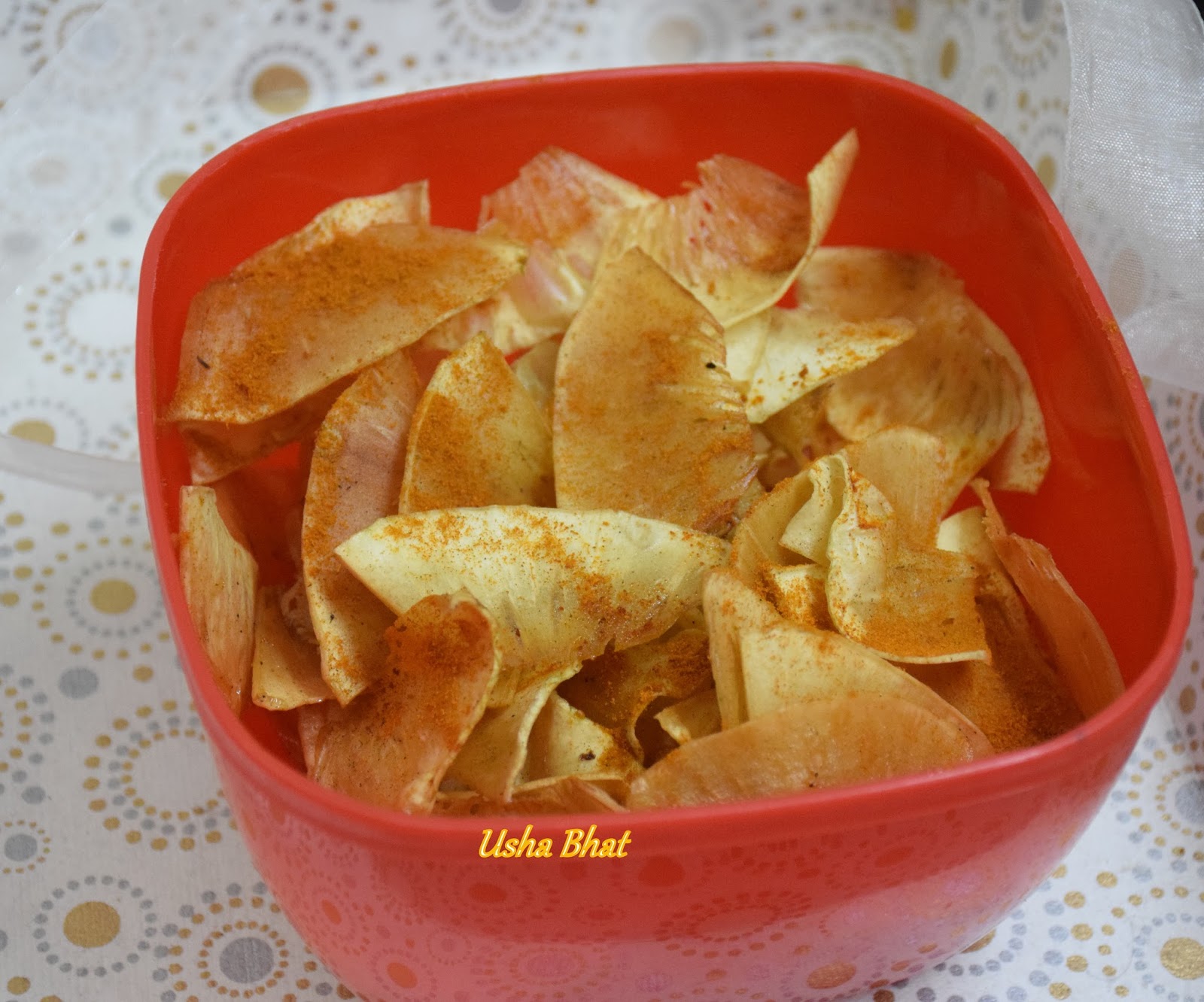 We had a breadfruit ( gudugo / jeev kadgi ) tree in our backyard when we were at Thrissur ! So when it was season most of the days we had gudugo / jeev kadgi in one form or other ! you will find many recipes of the dishes in this blog . The most favourite & most in demand was of course the chips/balukk made from the mature fruits ! Since this is easily made -I used to make this in large quantities even using up to 5 large ones and they used to be really gigantic ones . Stored in an air tight containers – they would remain crisp though they never used to last long because of my two sons who loved to eat them with every single meal 😋😋. so let’s see this very simple recipe that’s if you can call it one 😉😊