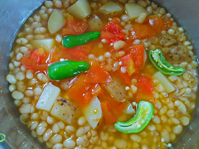 Cook the pulses in a cooker adding chopped potatoes. open the cooker lid, add chopped tomato and green chillies and salt.
