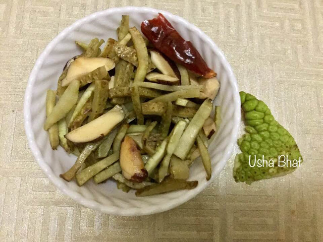 Breadfruit or gudugo / jeevkadgi in konkani is very much liked by us GSB’s and we make a variety of dishes with it . You an get the recipes for all these dishes in this very blog ! But we being GSB’s and our nature being not to waste any thing that can be converted into a delicious dish – use the skin too to make a very tasty upkari ! yes – gudugya / jeevkadgi saali upkari ! Let’s see the recipe – a very simple one yet so tasty – you will never again waste the skin !