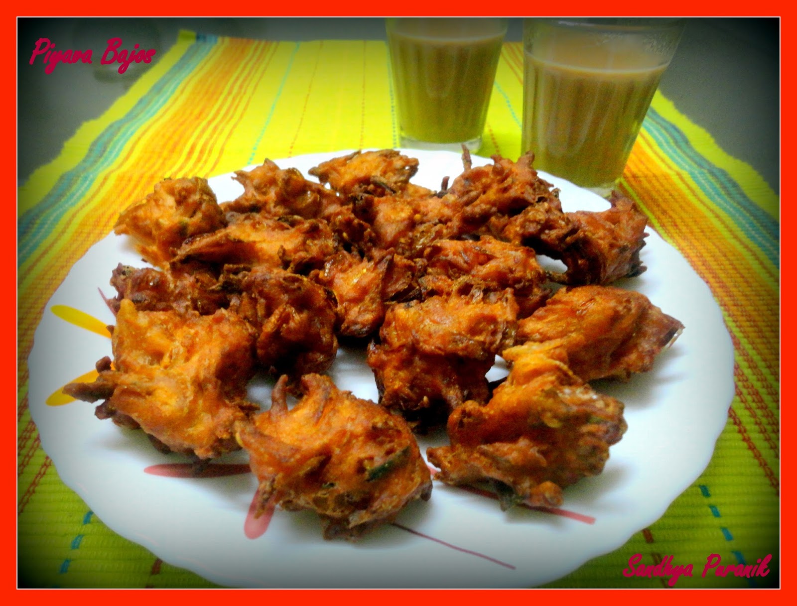 We all love having fried items… specially when it is pouring outside…don’t we?.Rains and bajos ( pakodas) compliment each other well and the most popular among the pakodas is the one with onions which we know as “piyava bajo” … or kanda bhajis as it is famously known all over the country.Me too made some last week on demand by my family when it was pouring heavily.The bajos with some cardamom flavored tea made the evening more beautiful.so why delay? .. I am sharing the recipe here so that all can enjoy and indulge.
