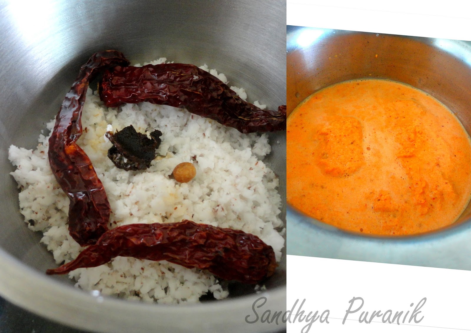 - Grind together the coconut, roasted hing, roasted chillies and tamarind to a smooth paste using enough water.