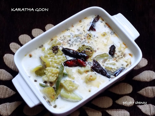 I always used to wonder about this peculiar name ” goon ” for this dish prepared with bitter gourds and green mangoes. You will love the wonderful blend of their bitterness and sourness and the natural sweetness brought by the coconut milk…So here goes the recipe