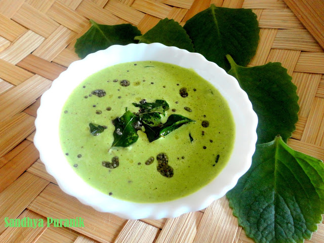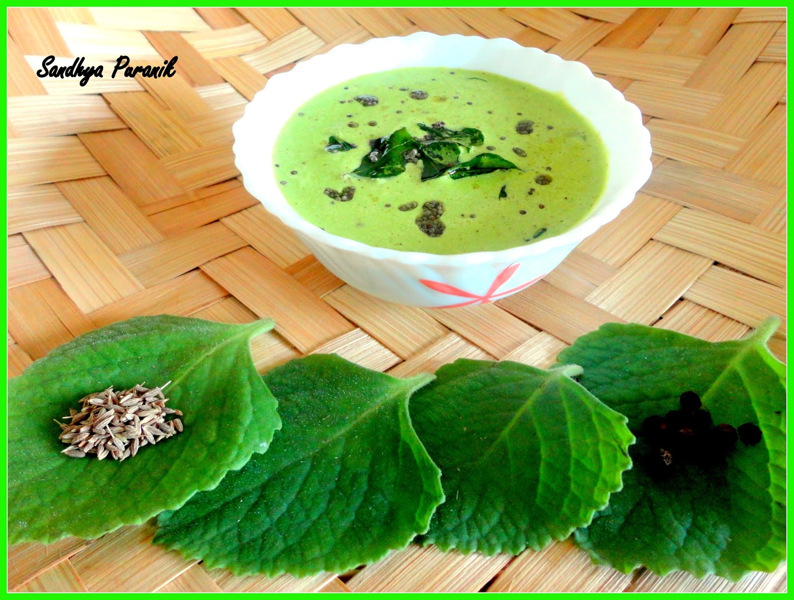 Sambarpalli is a herb which has many medicinal benefits and is used to cure cold and cough and also few culinary preparations.It can also be grown in small pots in the balcony. It is referred as ‘Ajwain leaves ‘ too commonly.,other names include ‘ Doddapatre in Kannada, ‘ Panikoorka in Malayalam,’ ova paan’ in Marathi. I have used it extensively as a remedy to cure cough and cold years back when my daughter was in infant stage.Recently I saw some fresh leaves in a vegetable store here and I could not resist buying them. But as neither of us had any cough and cold I decided to try ‘tambali’ which is a coconut based no heat curry used as an accompaniment .It is healthy as well as tasty and we all relished it.