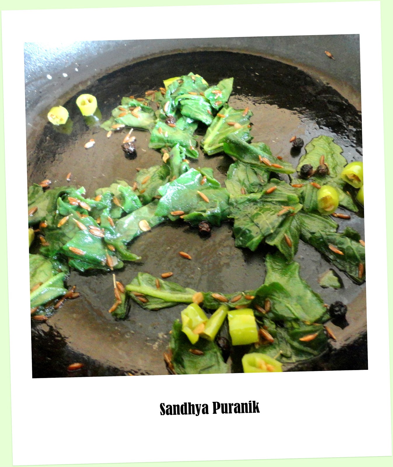 3. Once they splutter add the washed leaves ..tearing them roughly with hands and fry till you get a nice aroma and the leaves wilt.
