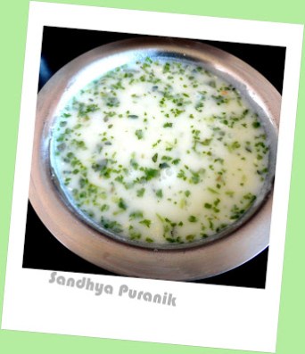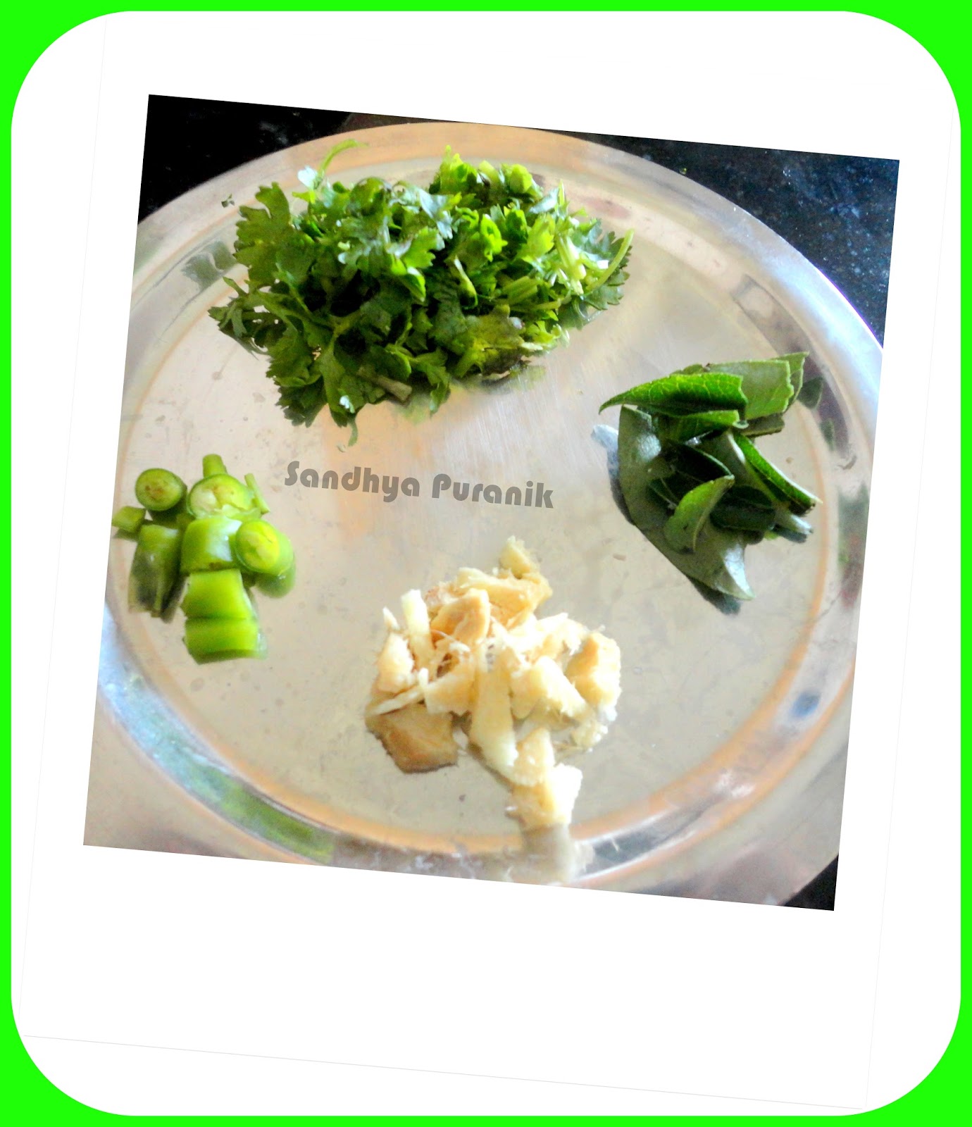 - Grind the chillies,ginger coriander leaves and curry leaves coarsely in a mixer adding a bit of water or some butter milk.