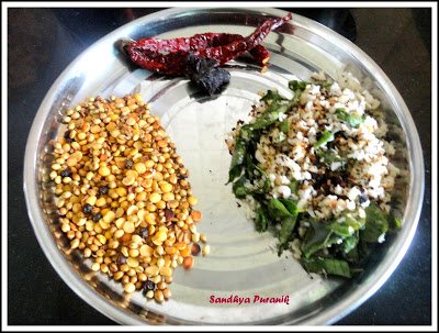 - Roast ingredients listed above in the same pan until the dal turns light golden and the seeds splutter.