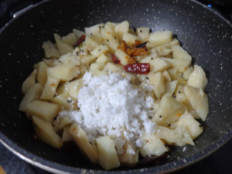 - Add powdered jaggery and grated coconut . Now cook for 2 more minutes