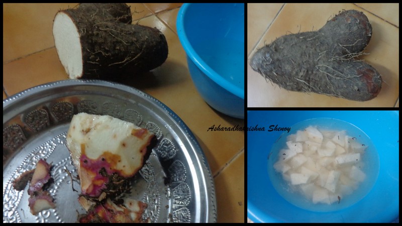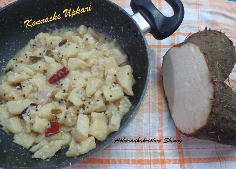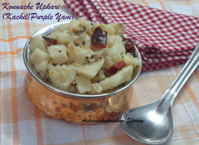 Purple yam is mentioned as Kon by mangalorean Konkanis and Kachil by in and Kochi side konkanis. It is a tuberous root vegetable,with uneven shape.They are usually in vivid violet to bright lavender colour and also in plain white colour. It has antioxidants which prevent diseases and controls Blood pressure to within normal range.