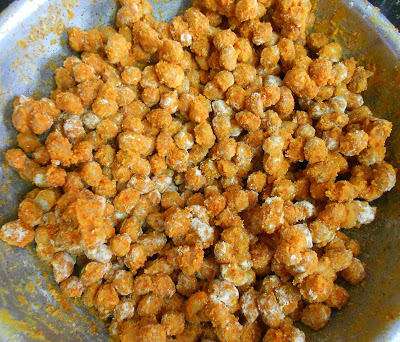 - Mix the groundnuts , chilli powder , haldi powder & salt together & keep aside for about 20 minutes.
