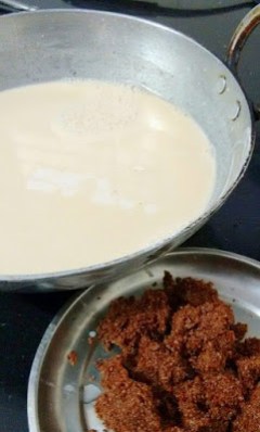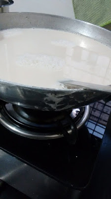 Now measure the batter in to a thick bottomed kadai. This was 3 cups of juice. so add same amount of water . So now added to it little salt and 3 cups of hot water.