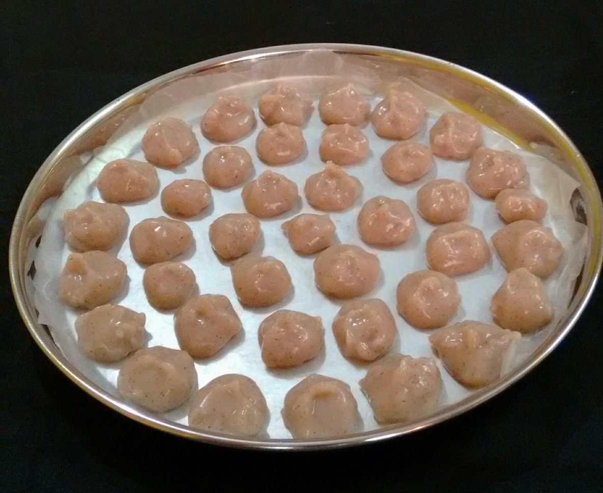 Vodis or sun dried fritters are very much a part of GSB Cuisine , Summer time is – when the sun is at its fiercest – is the time many venture out on to their terraces – early in the morning with their vodis batter and spread out the vodis , The sun plays its part in quickly drying them out . This is made in large quantities to be stored in air tight containers . So that whenever a need arises . the vodis are just fried and used for making nanchonya Uslis,