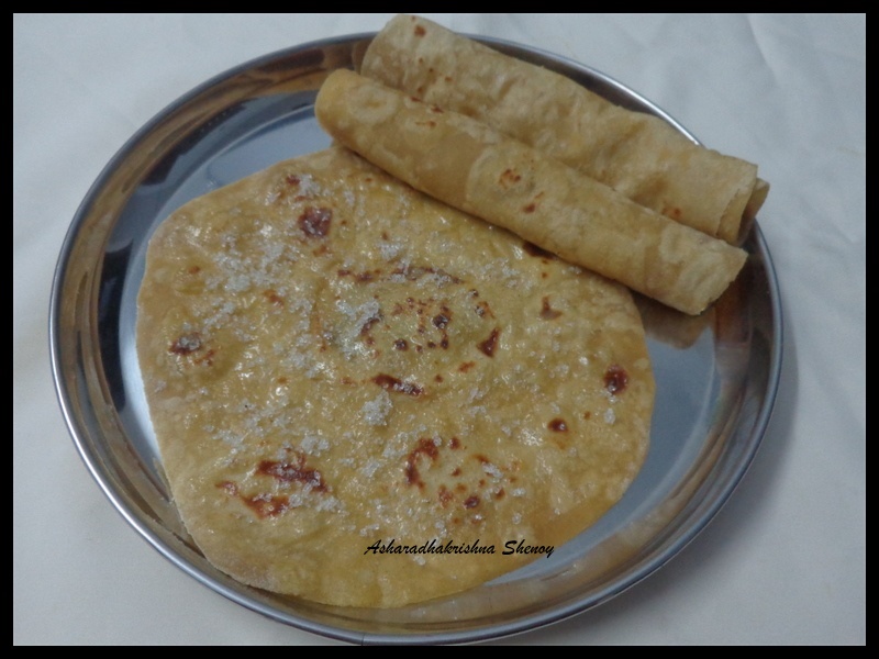 Chapathi is a flat bread which is also known as roti.It is made of whole wheat flour commonly known as Atta. It is one of the staple food of India,and we GSBians also include it in our diet – prepare this during normal days and fasting days. Earlier they were served to kids – by mixing sugar and ghee,and applying it on the hot chapathis and then rolling them up ..Kids enjoyed it a lot. But as a kid I was not a big of this until I started relishing chapatis with a spicy curry.