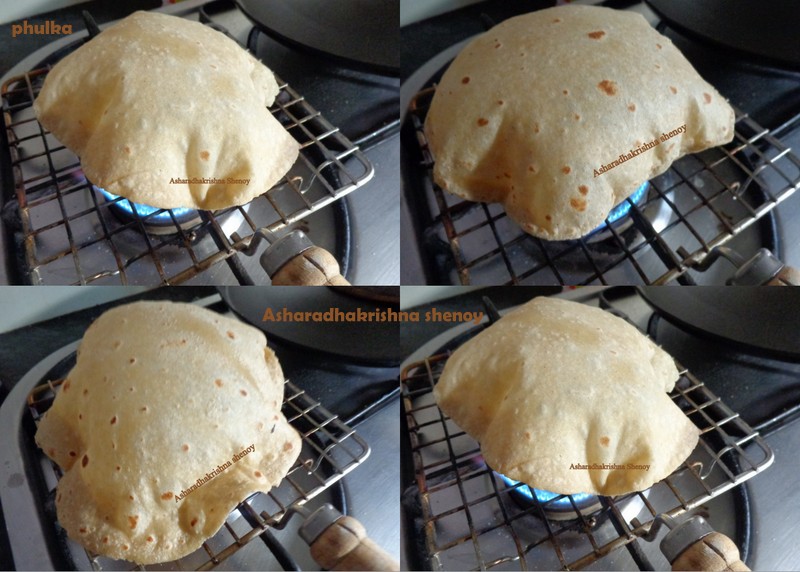 After frying each side once on a tava for a few seconds – place the half done chapathi on a roti grill placed on gas burner. Just keep for a minute on either sides and remove as soon as it has puffed up . Apply ghee on both sides .See the picture shared below.(I learnt this art of phulka making from my friend Jayashri Baleri, a co blogger in this blog.