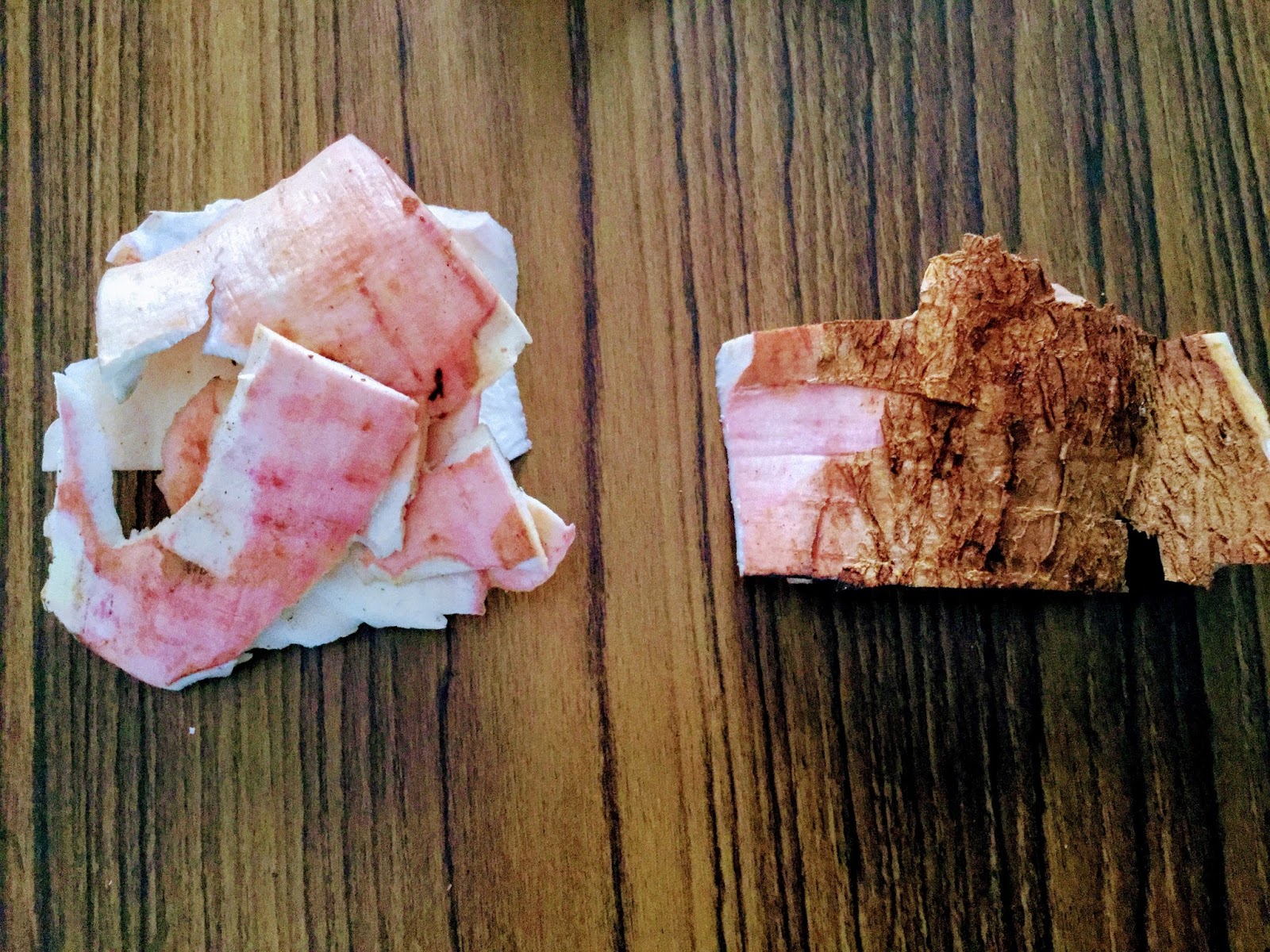 Remove the peels carefully from fresh tapioca . you will see there are two peels – a brown outer one & a thick pink coloured inner one ,,the inner peel is what we will use . You can easily separate the brown from the inner one .