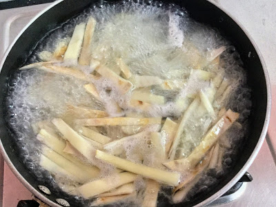 Wash and cut the pink peels into thin strips . Then drop them in boiling water in which you have about 1 tbsp of salt . ( Salt as per amount of peel . I used peels that I got from 1 kg of tapioca ).
