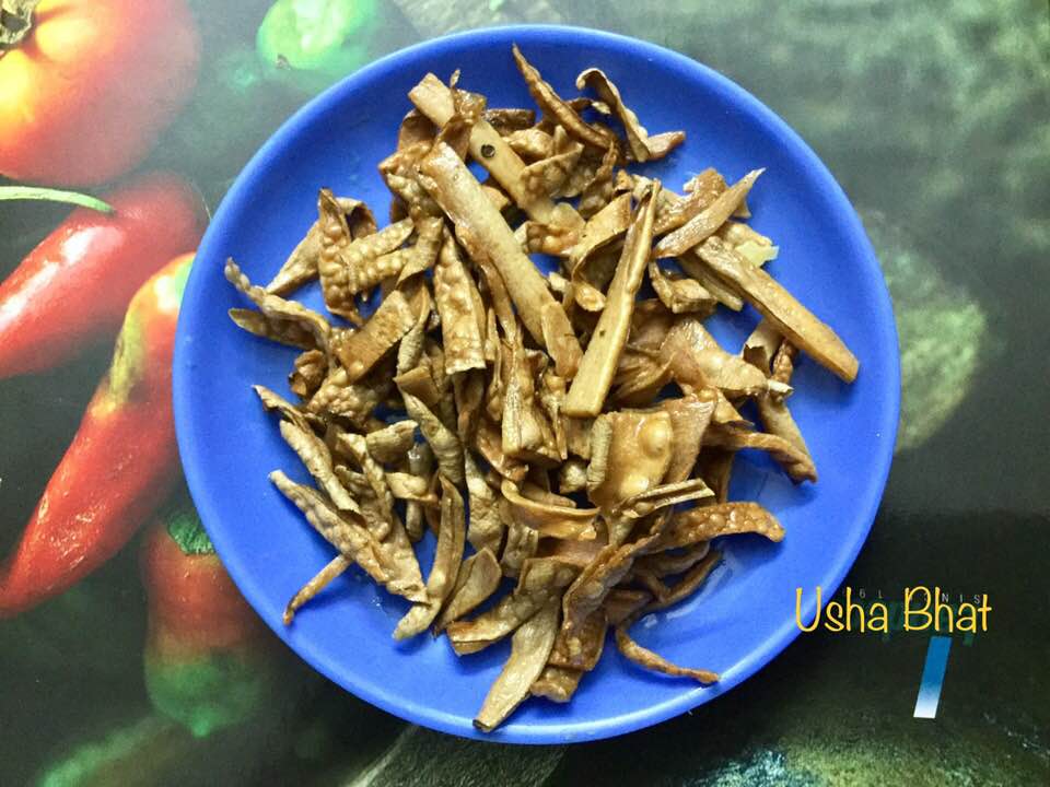 GSB women have always been very prudent while using any vegetable and keep wasting any part of it to the minimum .Thus we have several varieties of sun dried salted veggie peels which when fried can be an excellent side dish or an excellent combo with hot Pejj/ rice gruel , Varieties include – almost all that veggie parts that are discarded these days – like Kuvale / Ash gourd peels , Pumpkin peels and their soft fibre with seeds , mature string bean skins , potato peels etc, So here is one that is nowadays hardly known ,- peel of tapioca / kappa / badi kannang . Here is the pic of tasty fried peels which were first salted & then sundried .