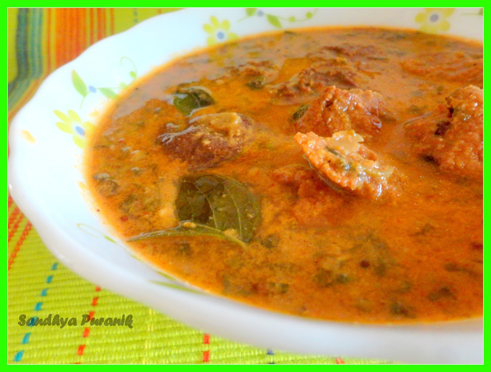 You can find many ambat recipes in this blog documented by me and my co-blogger friends. Most of the ambat recipes are with onion seasoning though there are times when mustard – curry leaves is also used to season the curry ! Today I am sharing one such ambat using amaranth(bhajji) leaves.The unique aspect about this curry is that this also has urad fritters in it . This is added to it along with seasoning or just after that which gives a nice crunchy bite to the curry. Do try this for a change and am sure you will like it.