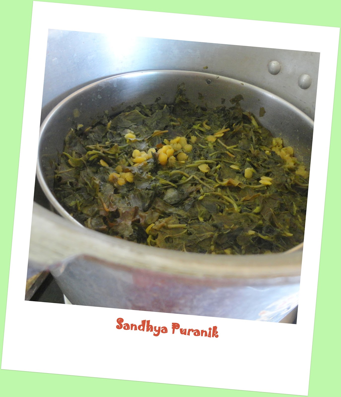 Pressure cook the chopped bhajji leaves and turdal for 2-3 whistles or until well cooked.