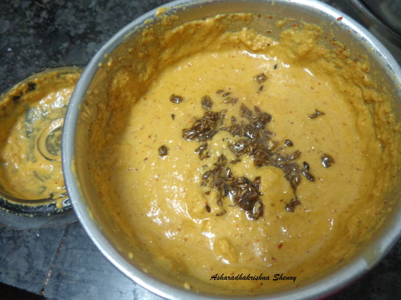 Grind together grated coconut,roasted red chillies and tamarind to a fine paste.
