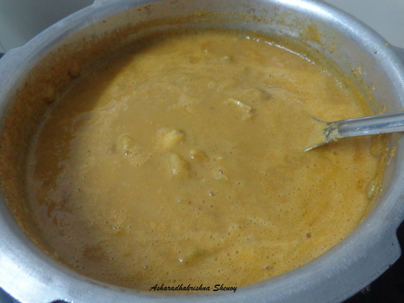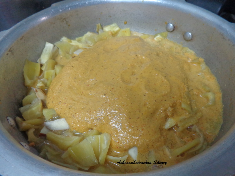 Remove the lid of the cooker and check whether the seeds are cooked and soft enough.Add the ground masala paste,add 1 cup water and bring to boil.(The curry becomes thick as and when its boiled,so can add enough water to the consistency required).