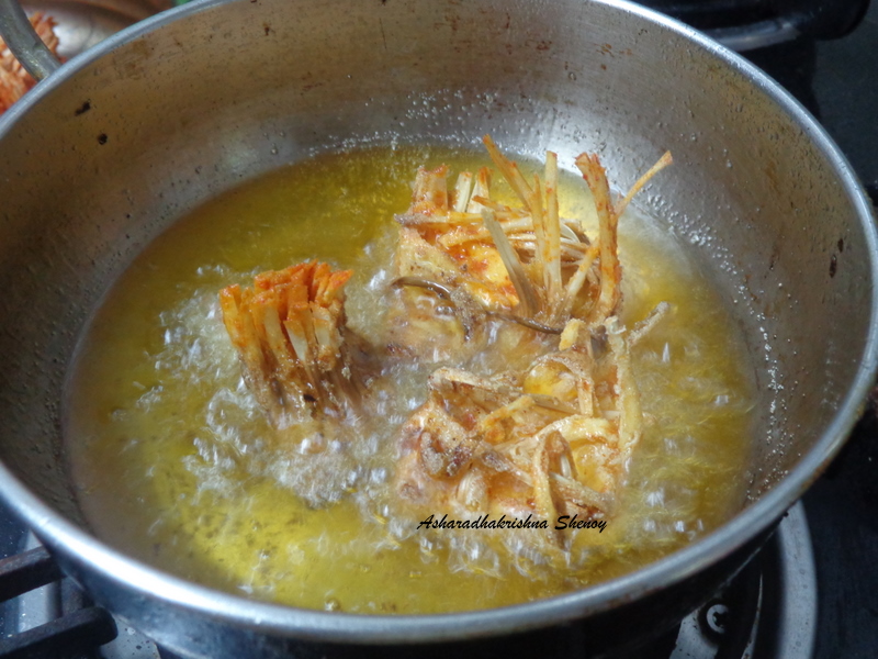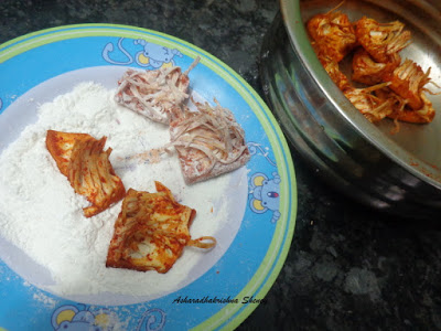 Heat kadai with sufficient oil to fry. Dust each and every piece of chari in the rice flour . Tap aside to remove the excess flour and then drop in the hot oil.