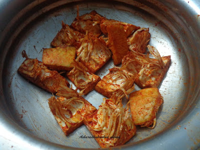 Cut the jack fruit and remove the bulbs.Then remove just the thorns and retain the rind part(which is called chari) with the white fiber (jack fruit rags ) surrounding the jack fruit bulb. (See the picture below )