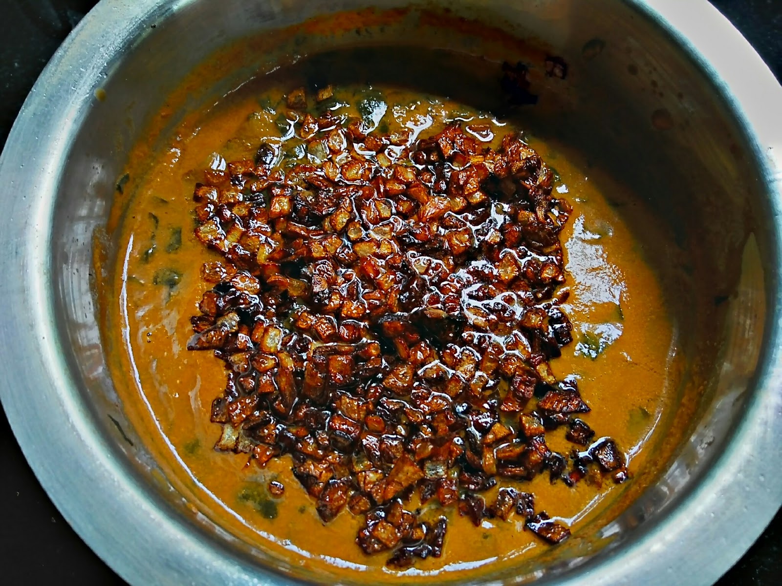 Add the finely chopped onion and fry it in coconut oil till golden brown.