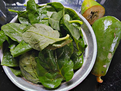 Rinse the vaali bhajji leaves in water and chop.Peel the raw papaya, deseed and cut into big cubes.