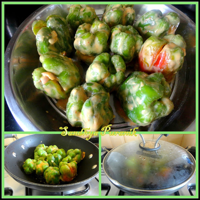 - Once they splutter simmer the flame and arrange the stuffed capsicums neatly one by one …sprinkle some water and close with a lid and allow to cook them in their own steam.