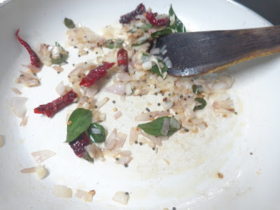 Heat a pan with oil,splutter mustard,add methi,red chillies and curry leaves.