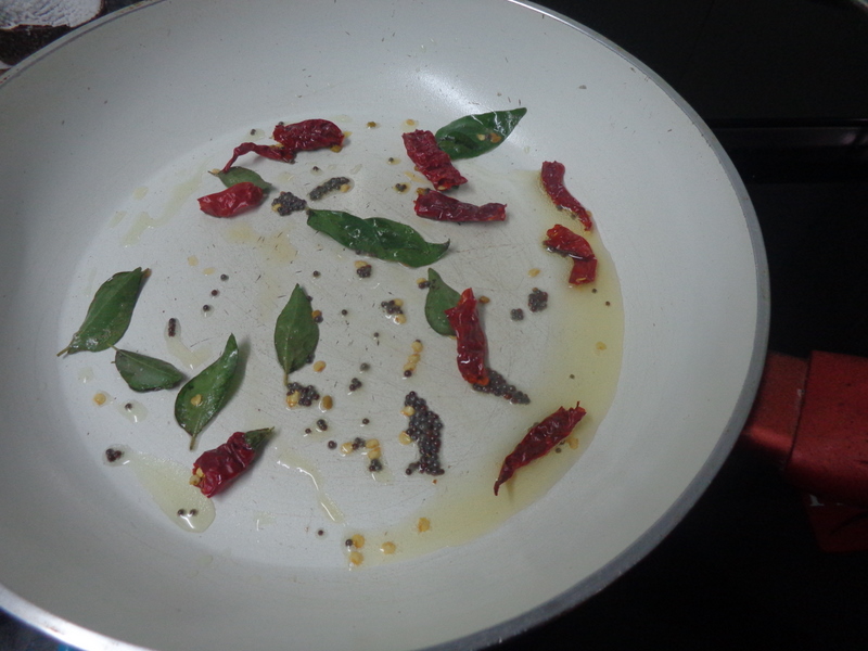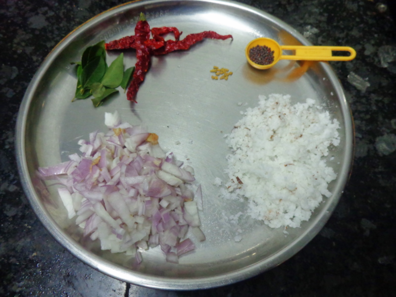 Keep mustard,methi,curry leaves,red chillies,chopped onions and grated coconut ready