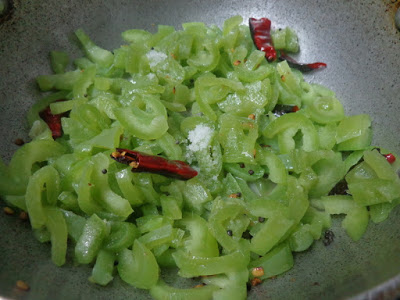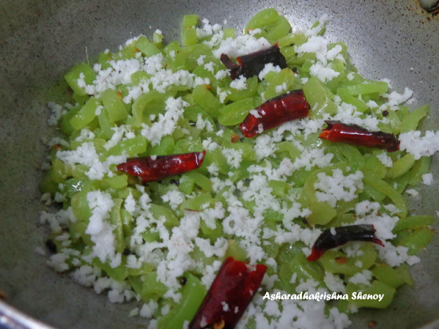 When the mustard starts to splutter add the chopped snake gourd/Podale.