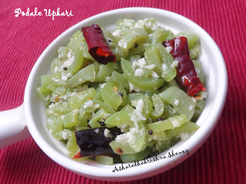 Podale or snakegourd is used in making upkaris & other side dishes .It has white spongy like seeds which are used for making sannapolo and bajo too. Snake gourd is a low calorie vegetable with fibre and water content. Though not many kids like it ,knowing about its health benefits will make sure that everyone includes it in their diet.