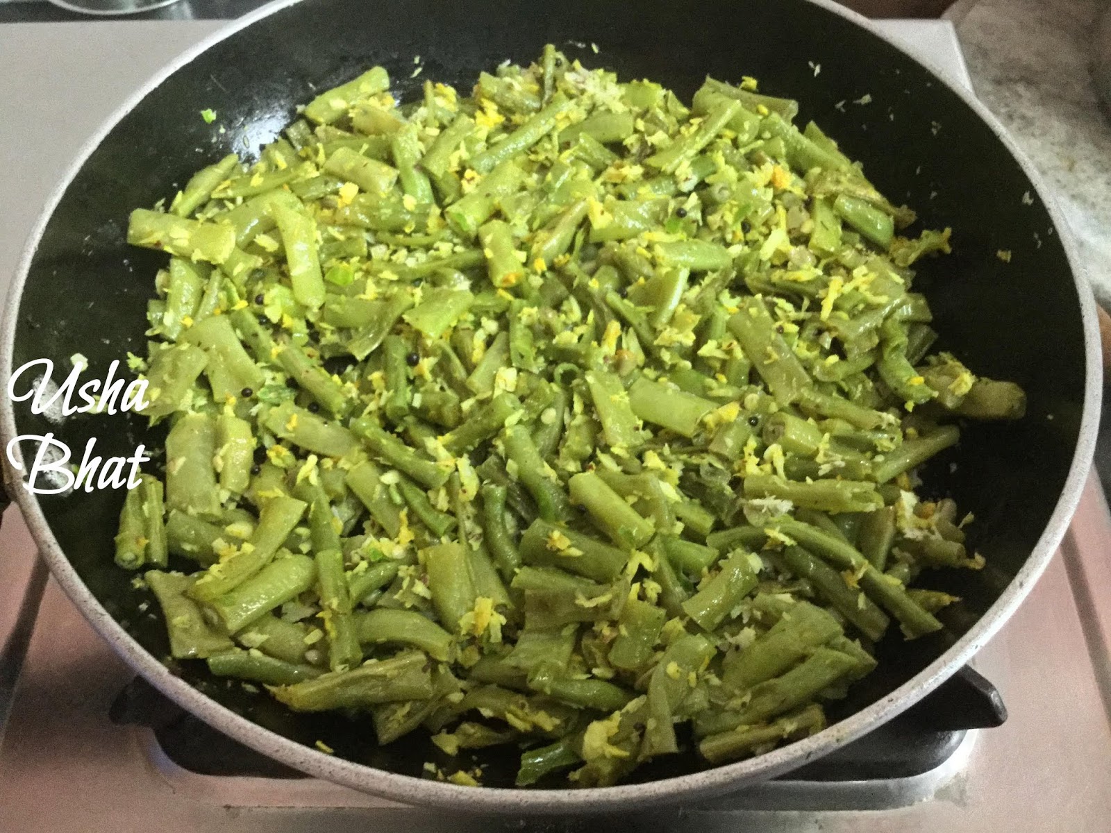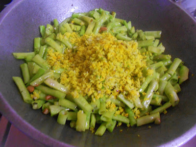 4. Grind the grated coconut along with the green chillies & turmeric powder to a coarse paste .and add to the beans