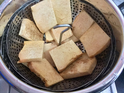 Cut the yam into square 1/2 inch thick slices , Place in a steamer and pressure cook for just one whistle , See that the pieces have just cooked but are still firm and not soft .