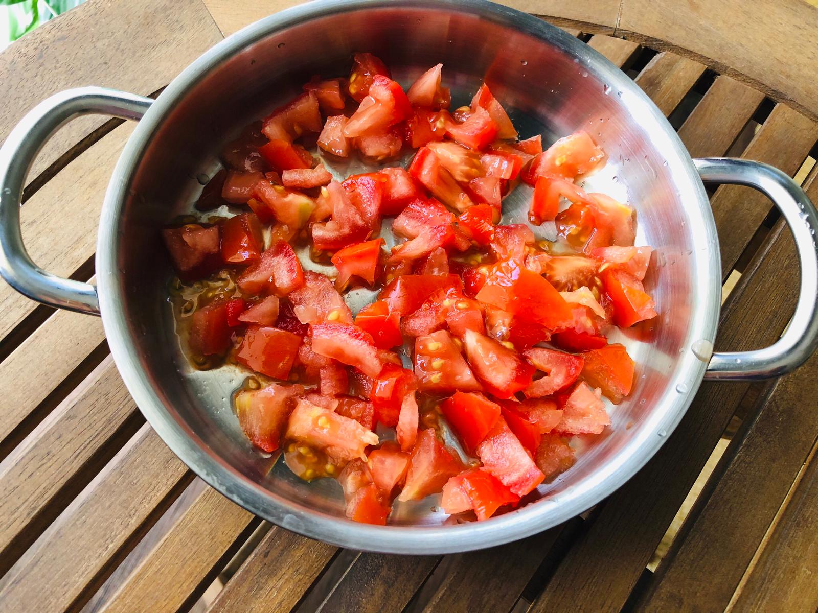 - When roasted pour the seasoning over the tomatoes and mix well .